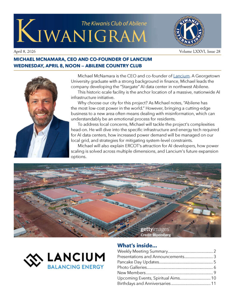 First published in 1946, the Kiwanigram is the weekly newsletter of the Kiwanis Club of Abilene. Our club is quite proud of this award-winning publication. Each edition includes previews of upcoming meeting programs, summaries of previous weeks’ meetings, photo galleries, and so much more.